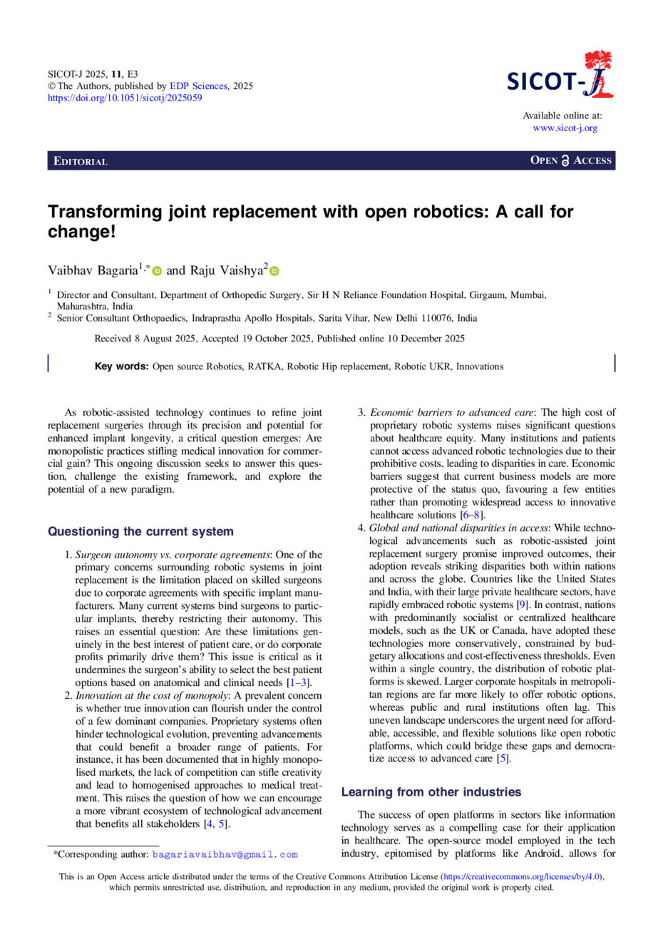 Key words: Open source Robotics / RATKA / Robotic Hip replacement / Robotic UKR / Innovations